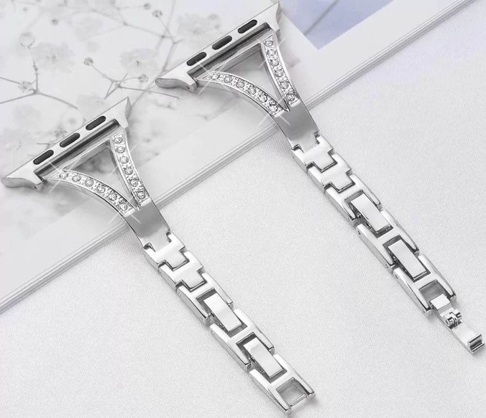 Pulseira Aço Slim Strass Prateada Compatível com Apple Watch